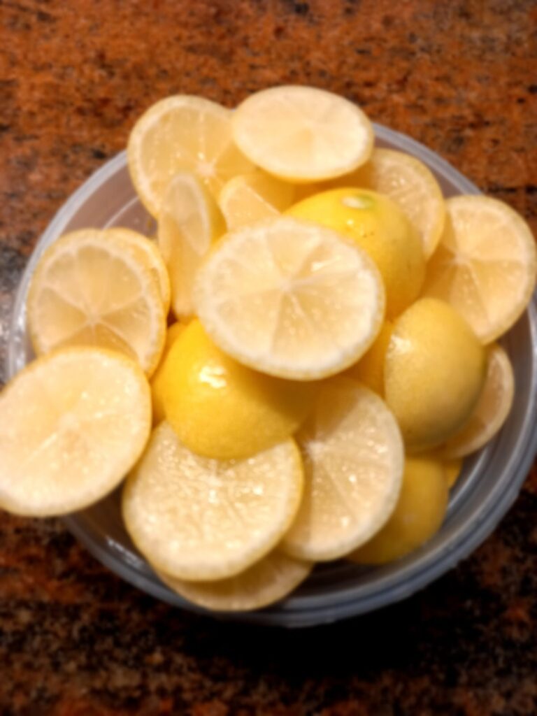11. ליצור חייץ (שכבת הפרדה) בין הלימון בכלי לבין המשקלות שיבואו בהמשך, עם דיסקות קליפות לימון ננסי שבסעיף 2. (אפשר להשתמש בפרוסות לימון רגיל).
